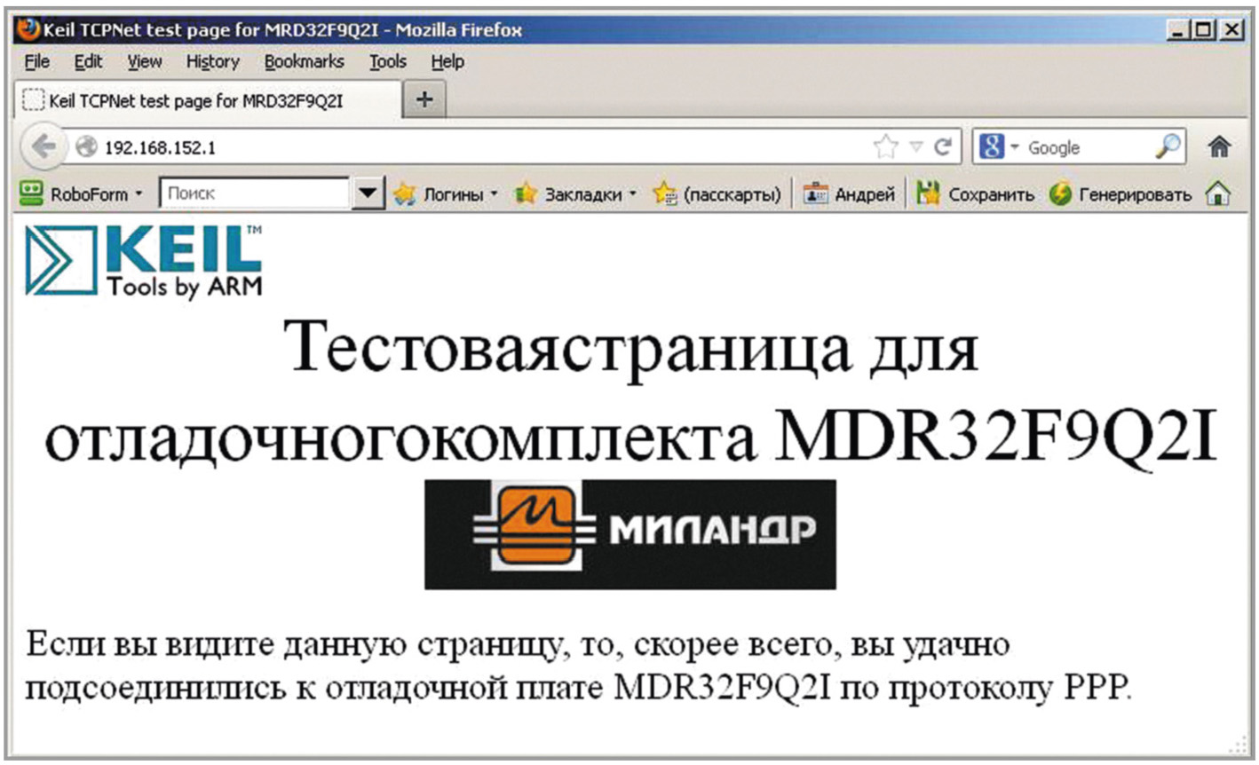 Такой обмен строками характерен при установке прямого соединения через последовательный порт компьютеров под управлением операционных систем Windows. После этого было настроено прямое подключение к плате через последовательный порт и произведено подключение по протоколу PPP. С помощью браузера была открыта страница HTTP-сервера (см. рис. 5).