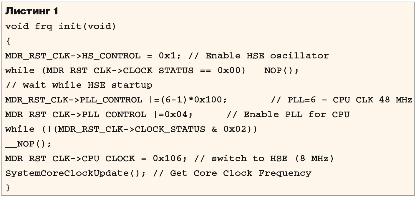 Каждый из перечисленных регистров подробно описан в спецификации на микроконтроллер на интернет-странице производителя [2]. Для инициализации тактового генератора на частоте 48 МГц была разработана следующая функция (см. листинг 1).