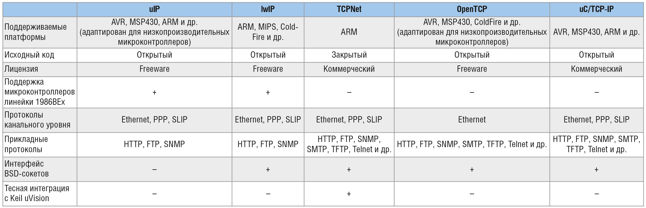 В сравнительную таблицу 1 включены три вышеперечисленных стека. Видно, что стек RL-TCPNet хотя и обладает рядом недостатков, среди которых тесная связь с единственной средой Keil uVision и закрытый исходный код, но имеет неплохие возможности и уверенно конкурирует с другими стеками для встраиваемых приложений. Поэтому наличие порта на микроконтроллере MDR32F9Q2I будет более чем уместно.