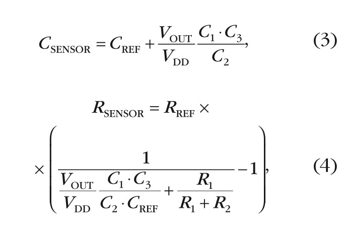 Путём передачи заряда выходные сигналы резистивного и ёмкостного мостов согласованы с усилителем с ёмкостной обратной связью, выполняющим преобразование заряда в напряжение. При этом выходное напряжение канала VOUT будет связано с параметрами чувствительных элементов соотношениями [4]