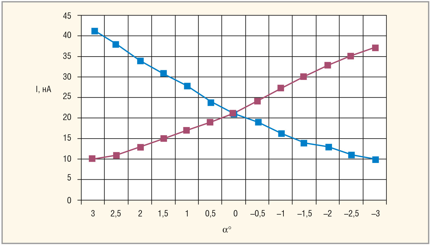 На рисунке 3 приведены графики зависимости тока фотодиодов от углов отклонения МЭ первого и второго каналов I1 = f1(a) и I2 = f2(a), полученные в процессе реальной юстировки и оптической регулировки дифференциального ВОПУП.