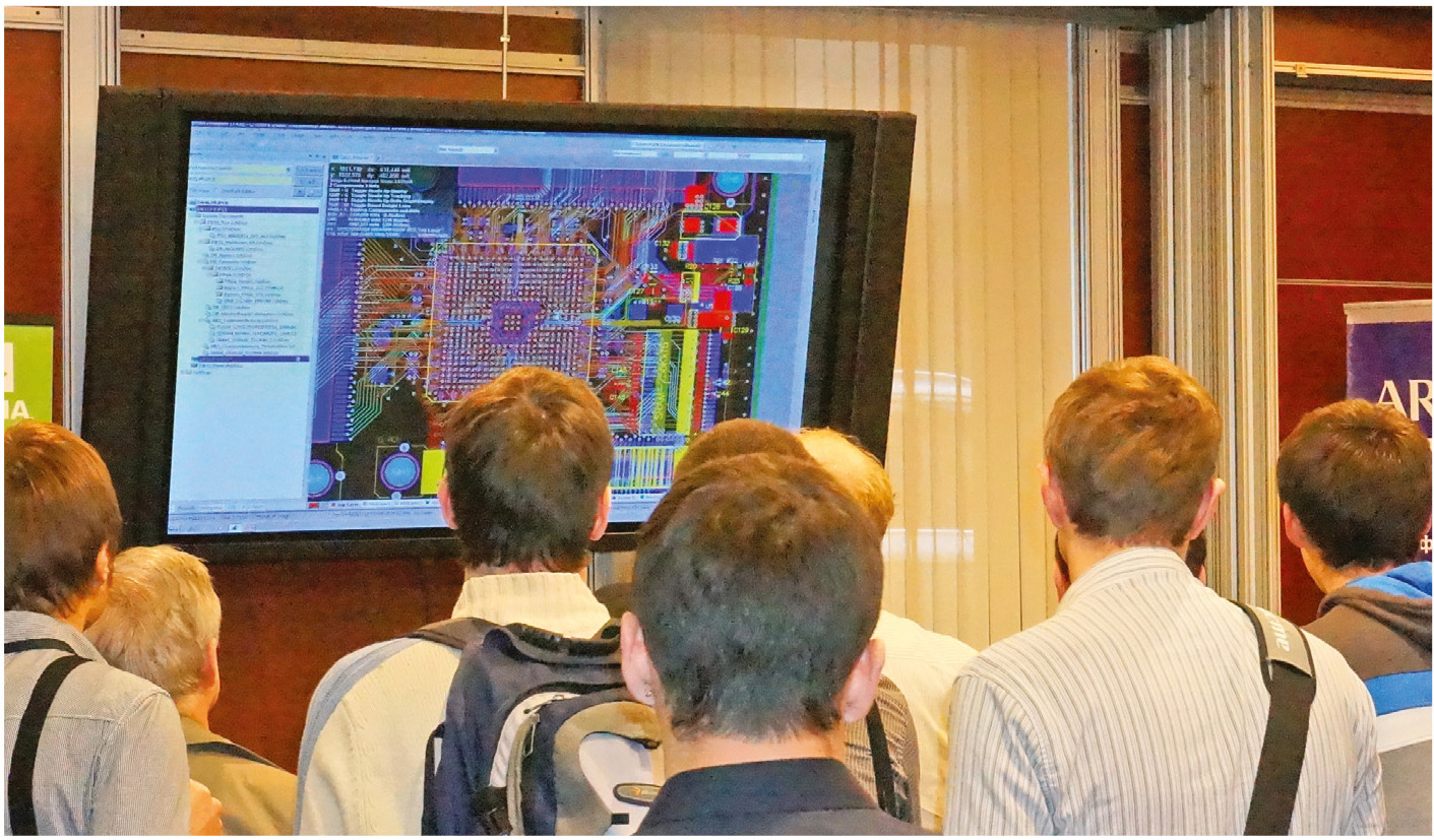 На центральном экране «User-zone» осуществлялись демонстрации по темам, специально подготовленным представителями компаний-партнёров и техническими специалистами компании Altium. По-прежнему актуальным остаётся вопрос импорта данных из P-CAD в Altium. Специалист компании «НИП-Информатика» Андрей Палачёв рассказал об особенностях импорта в новейшую, 14-ю версию. Две демонстрации провел эксперт НПП «РОДНИК» Алексей Сабунин – первая касалась ключевых приёмов создания правил проектирования печатных плат в Altium Designer 14, а вторая, подготовленная совместно с техническим экспертом Altium Робертом Хуксэлом, была посвящена вопросам централизованного управления данными в Altium Vault. Продакт-менеджер Altium Марти Хауф рассказал о гибкожёстких печатных платах и встраиваемых в них компонентах, а представитель CSoft Самара Павел Ярославцев – об основных приёмах интерактивной трассировки в Altium Designer 14.