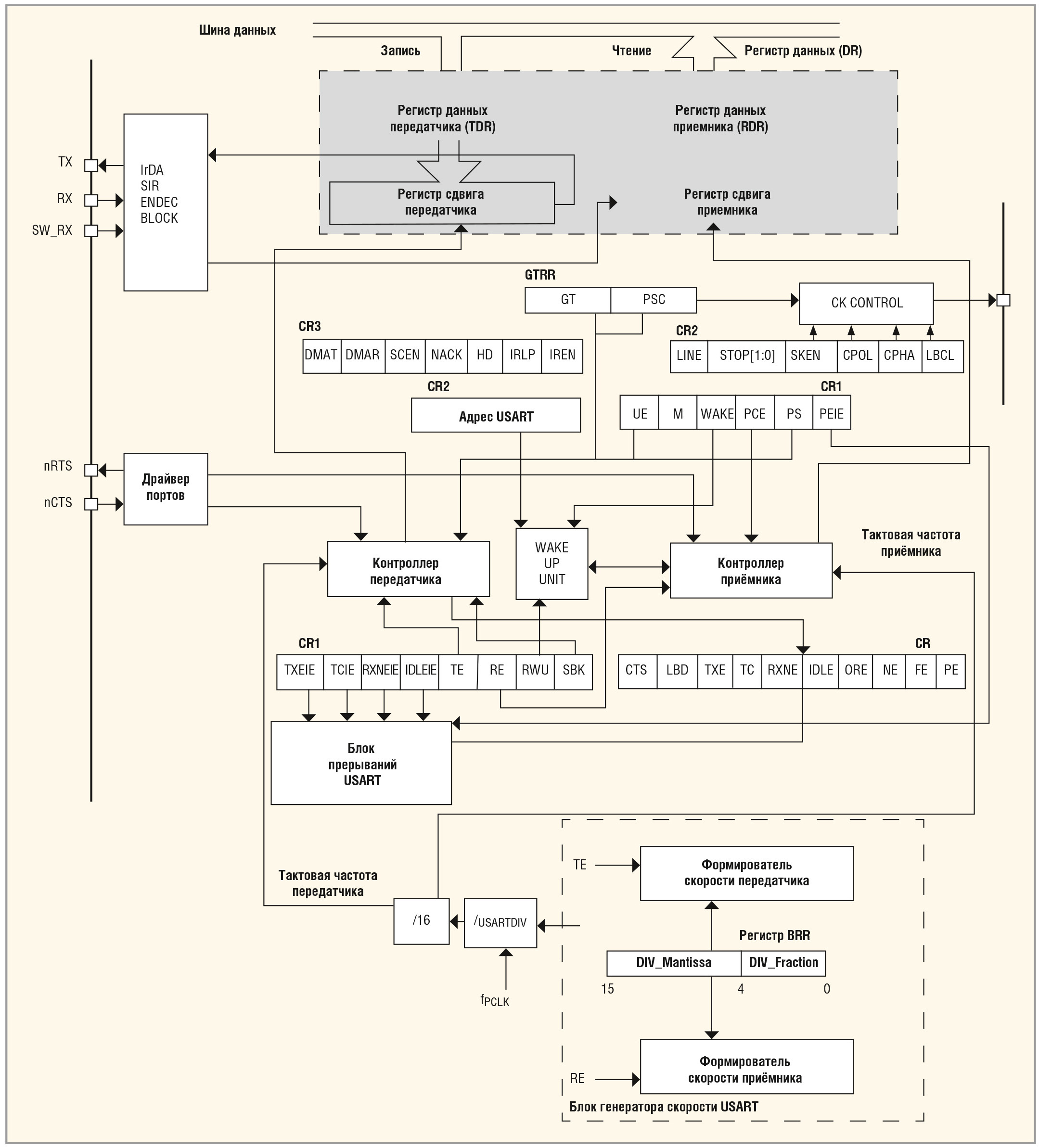 - USART_DR – регистр данных для записи передаваемых и чтения принимаемых данных;