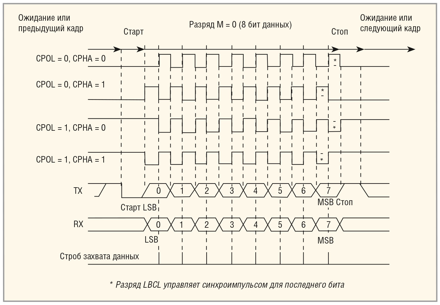 Разряды CPOL, CPHA и LBCL не должны изменяться во время активности передатчика.