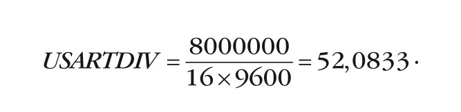 Рассмотрим пример вычисления значения переменной USARTDIV для скорости порта USART, равной 9600 бод с тактовой частотой 8 МГц.