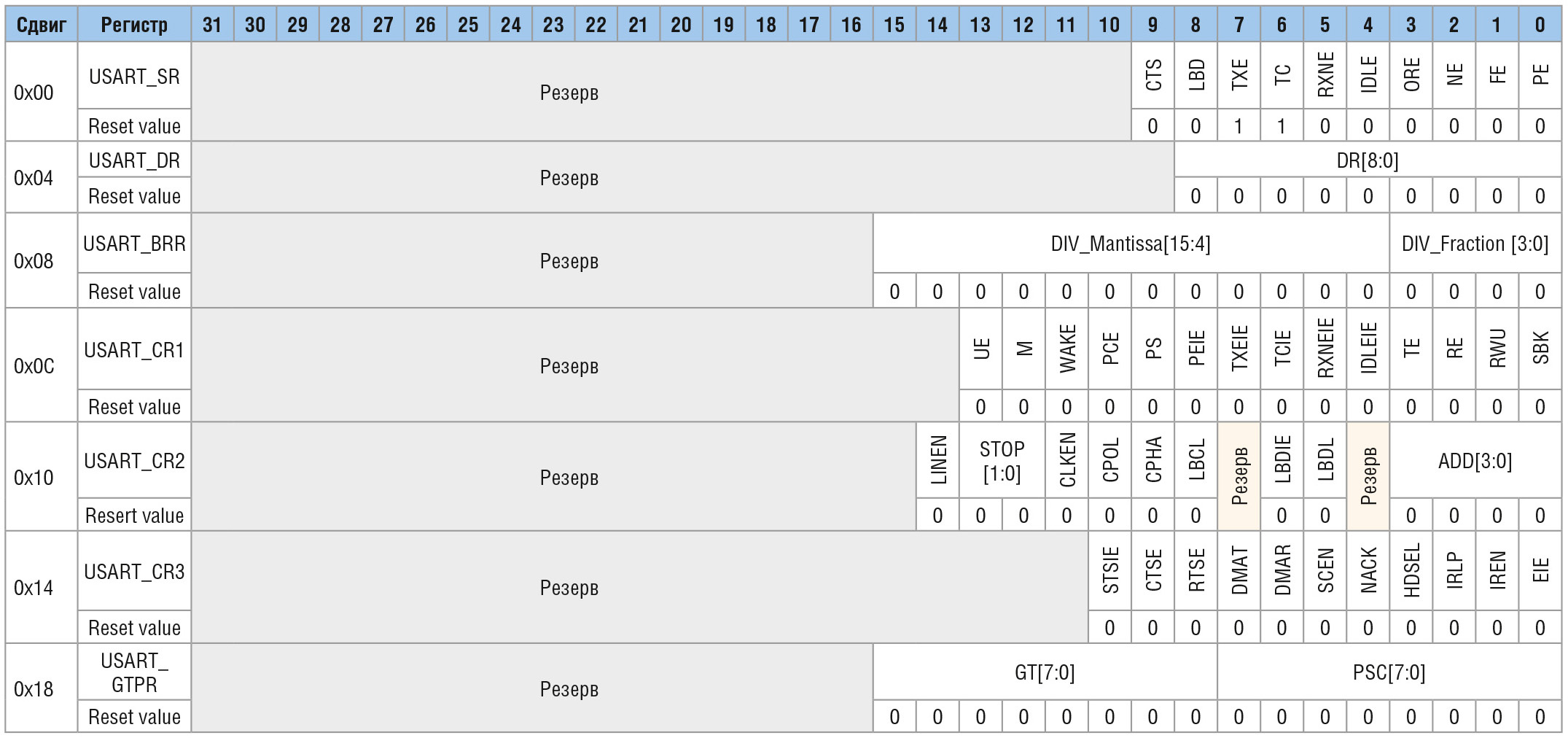 - USART_GTPR – регистр делителя и задержки.