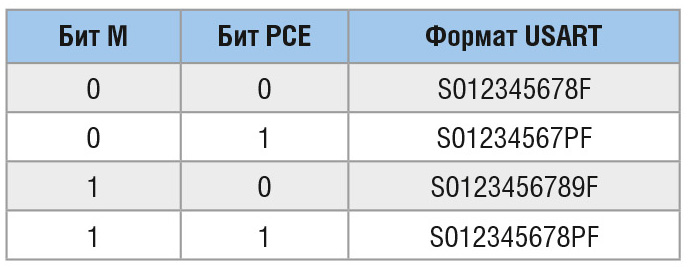 Для наглядности в таблице 2 приведён формат кадра данных USART в зависимости от установки разрядов M и PCE.