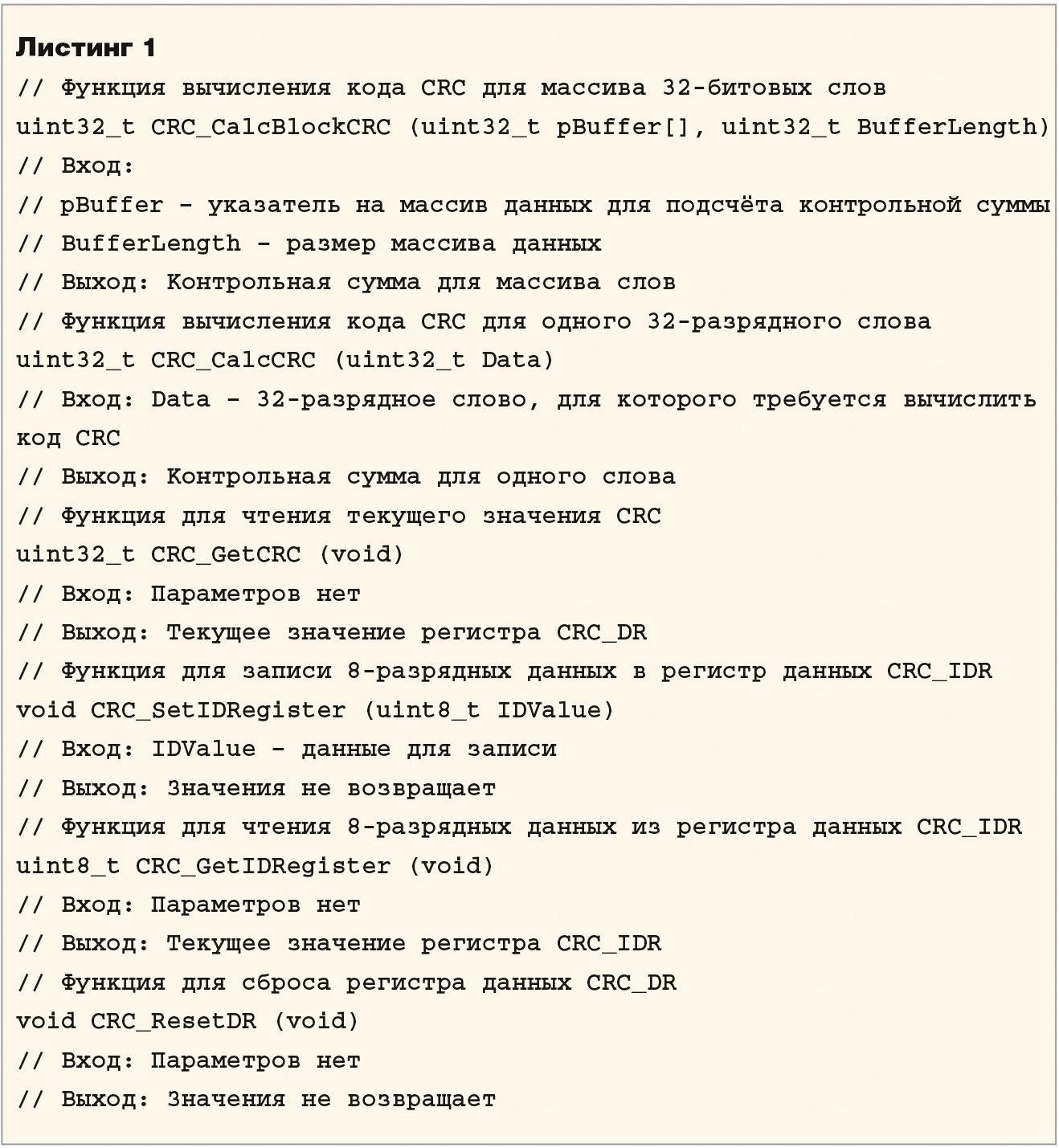 Библиотека CMSIS предоставляет целый набор функций для работы с блоком CRC. Функции этой библиотеки и подробные комментарии к ним представлены в листинге 1.