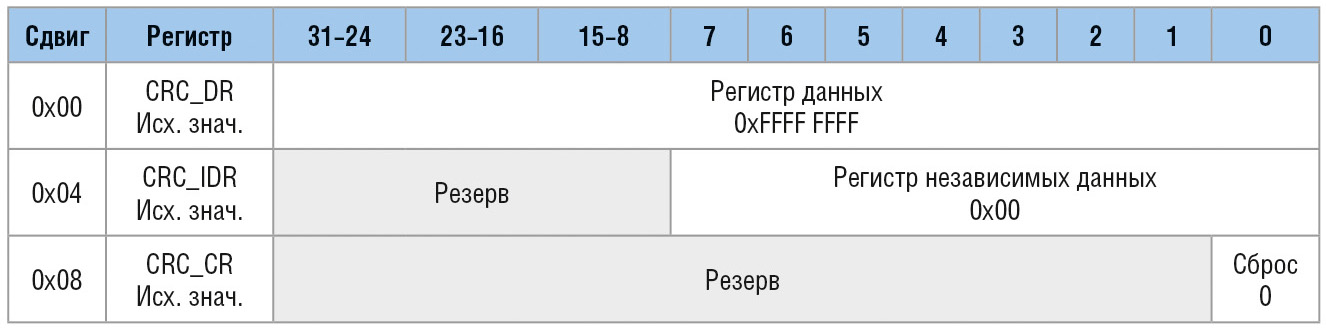 В таблице приведена карта регист­ров блока вычисления CRC, а также и их значения после сброса.
