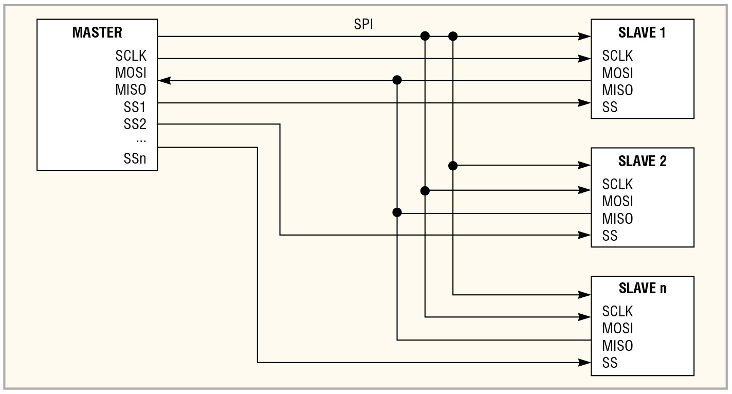 По интерфейсу SPI можно связать ведущий микроконтроллер с одним или несколькими ведомыми устройствами. Схема подключения устройств по интерфейсу SPI показана на рисунке 1.