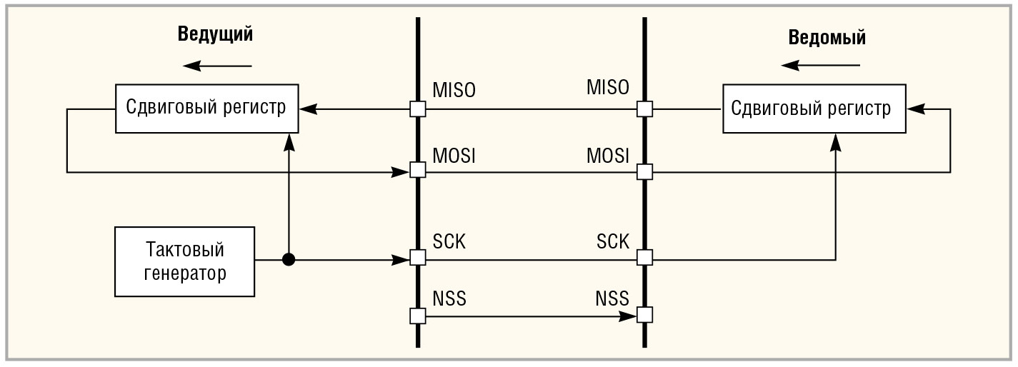 На рисунке 2 приведена функциональная схема интерфейса SPI для двух подключённых друг к другу устройств, одно из которых определено как ведущее, а второе – как ведомое.