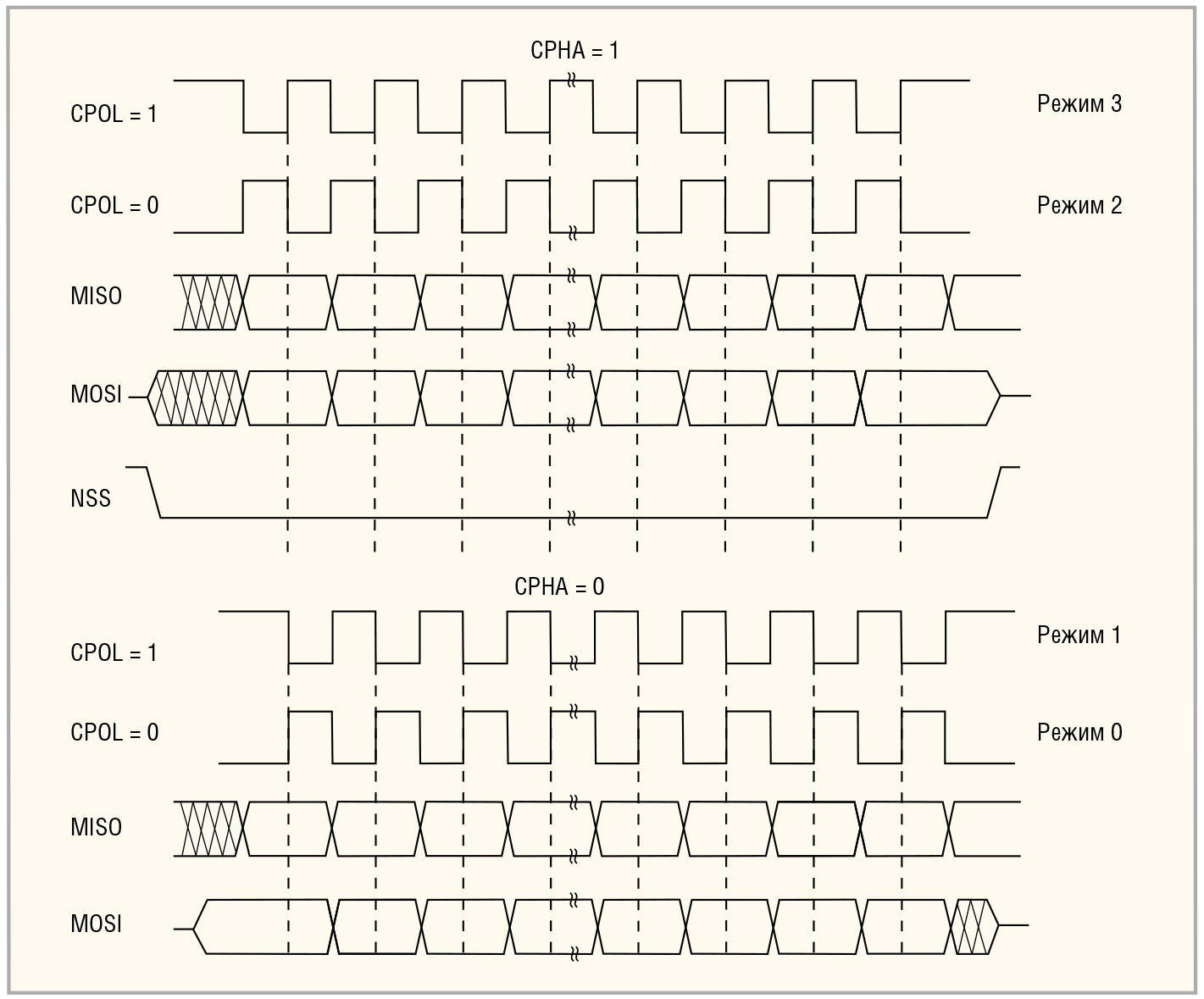 Существует четыре режима передачи данных по SPI, которые определяются полярностью и фазой тактового сигнала. Отличие режимов заключается в том, что активным уровнем сигнала синхронизации может быть единичный или нулевой потенциал, а запись данных может производиться по фронту или спаду импульса данного синхросигнала. Эти режимы интерфейса обозначаются цифрами 0, 1, 2 и 3. На рисунке 3 – диаграмма всех перечисленных режимов работы интерфейса SPI.