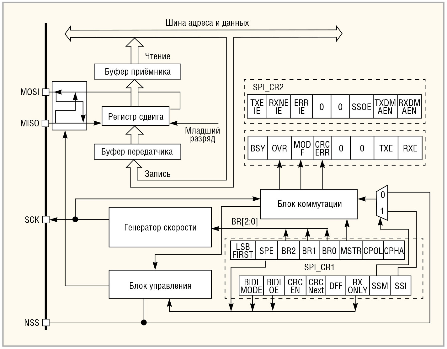 - SPI_CR1 – первый управляющий регистр;