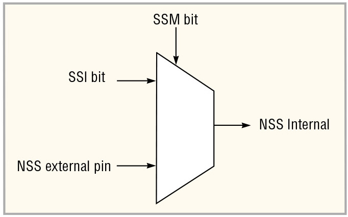 На этой схеме показано формирование сигнала управления NSS Internal из внешнего сигнала NSS external pin или программного сигнала SSI bit. Выбор источника сигнала NSS производится с помощью программного разряда SSM. Разряды SSM и SSI принадлежат регистру управления SPI_CR1.