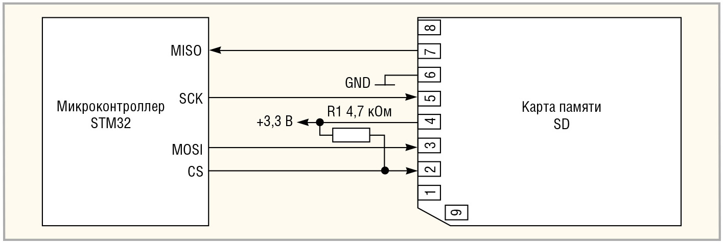 Кроме стандартных функций, интерфейс SPI микроконтроллера STM32 содержит два аппаратных блока вычисления циклического избыточного кода CRC. Один блок CRC используется для передаваемых данных, а второй – для принимаемых данных. Оба блока могут вычислять циклический избыточный код для 8- и 16-битных данных. Эта функция особенно необходима при подключении к SPI карт памяти типа MMC или SD. Схема подключения карты памяти к микроконтроллеру через интерфейс SPI приведена на рисунке 6.