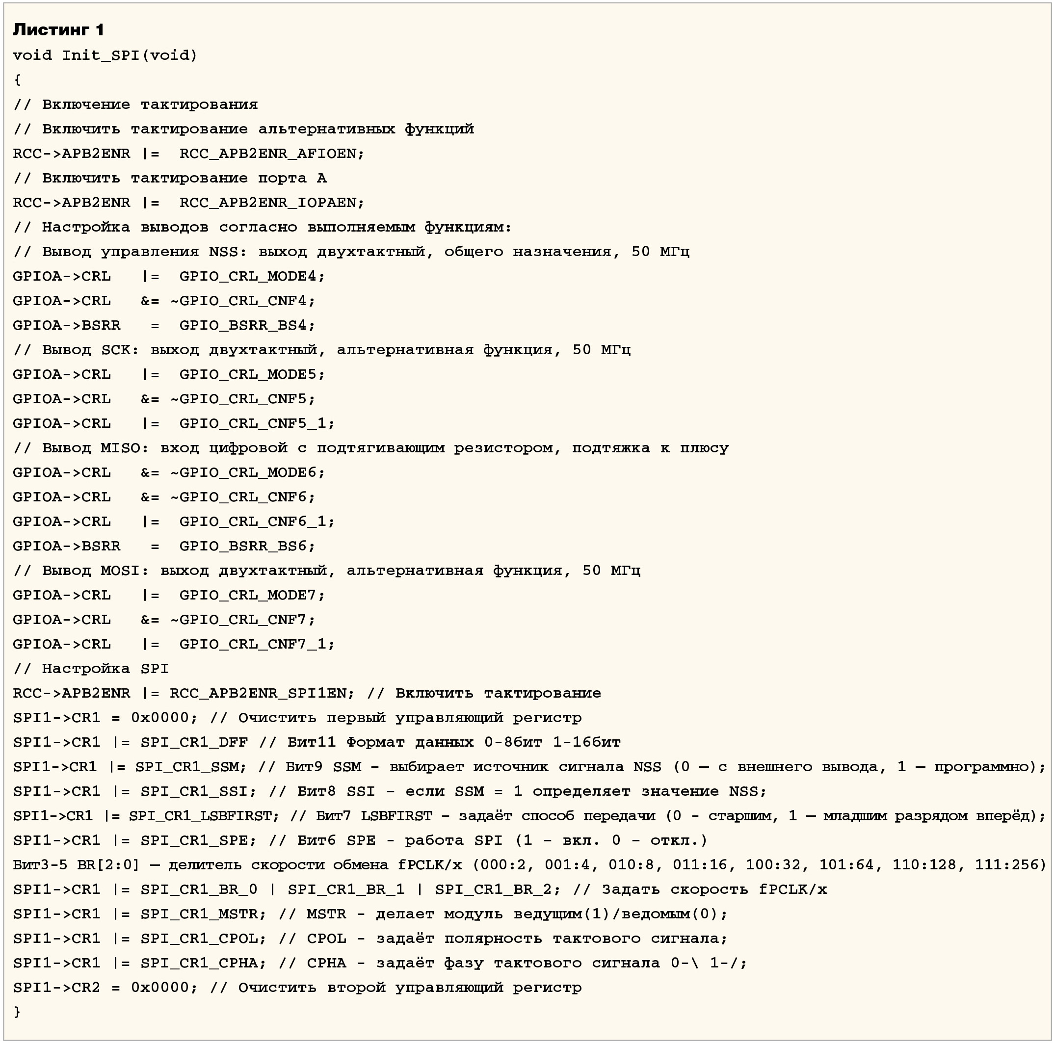 В листинге 1 приведена функция инициализации интерфейса SPI в соответствии с описанным выше алгоритмом.