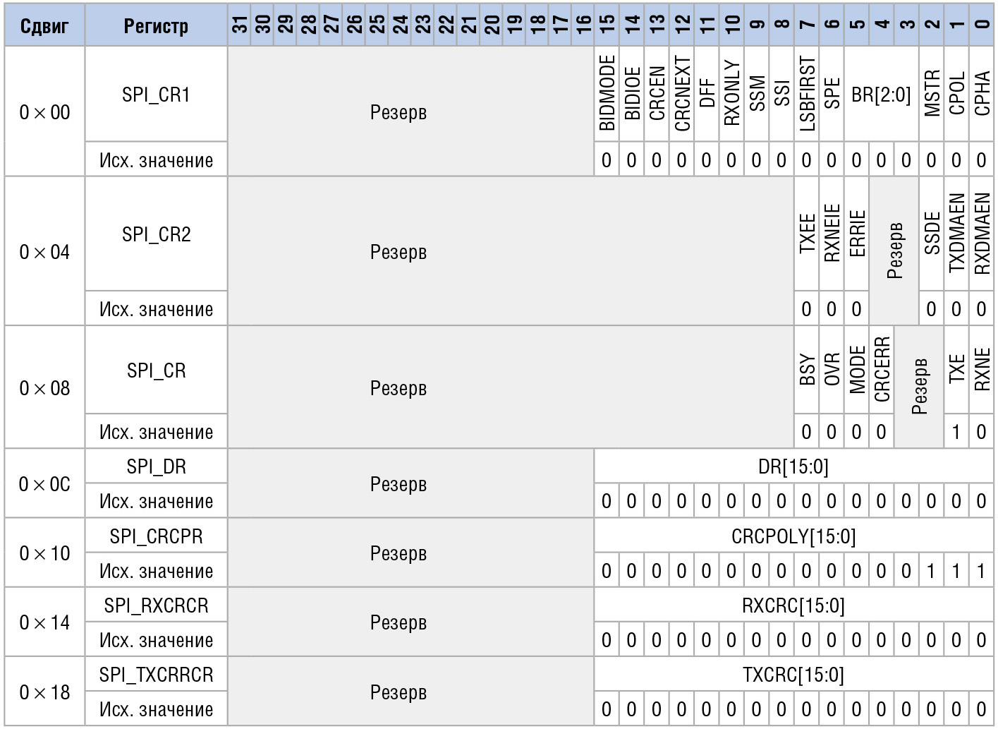 - SPI_TXCRCR – регистр, содержащий CRC передаваемых данных.