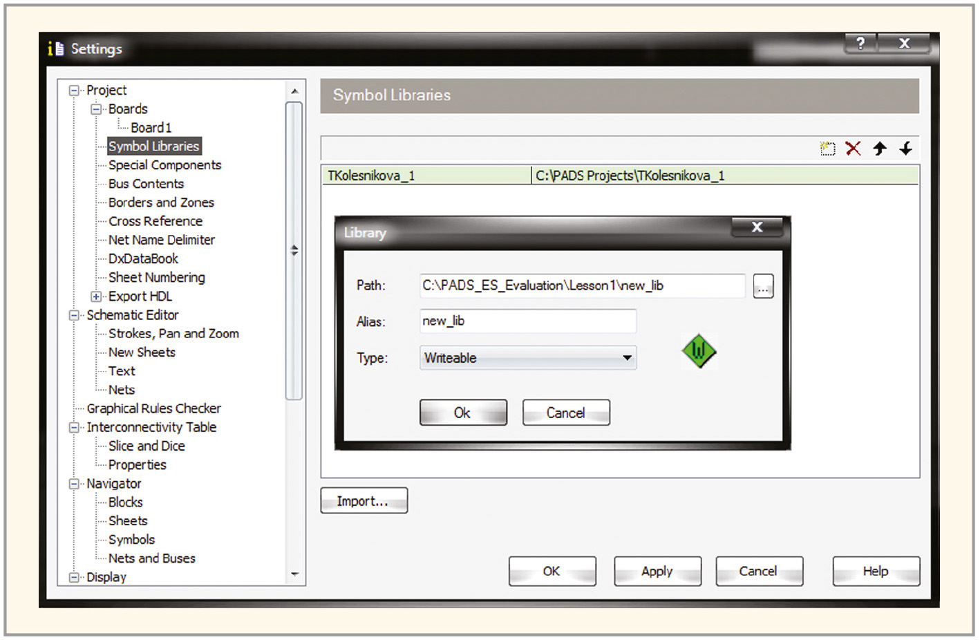 По умолчанию при создании нового проекта формируется новая библиотека. Для создания ещё одной библиотеки используйте меню Setup/Settings… редактора DxDesigner. Откройте окно Settings и в левой панели в группе Project выберите пункт Symbol Libraries. В открывшемся окне создайте новую библиотеку. Для этого нажмите на значок (создать). В появившемся окне Library, в поле Path укажите местонахождение библиотеки или измените существующее. Обратите внимание, что на данном этапе создания библиотеки тип Readonly в поле Type будет единственно доступным – изменить его сейчас невозможно. Для завершения процесса создания библиотеки нажмите на кнопку ОК, затем система запросит создание новой папки для библиотеки. После утвердительного ответа вернитесь в окно Settings, в правой части которого в списке библиотек появится только что созданная библиотека. Она будет пустой до тех пор, пока в ней не размещены новые элементы.