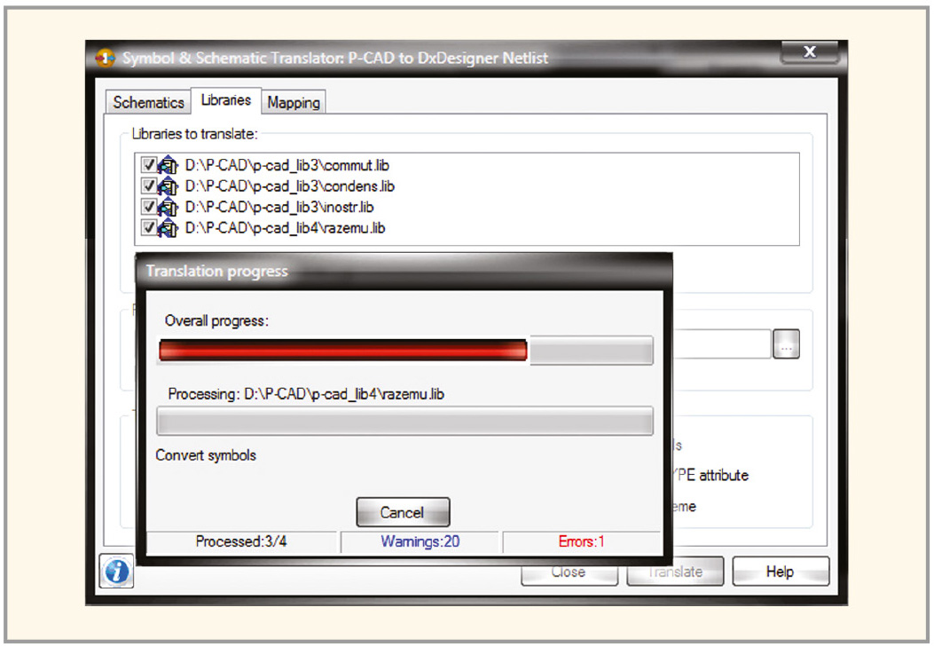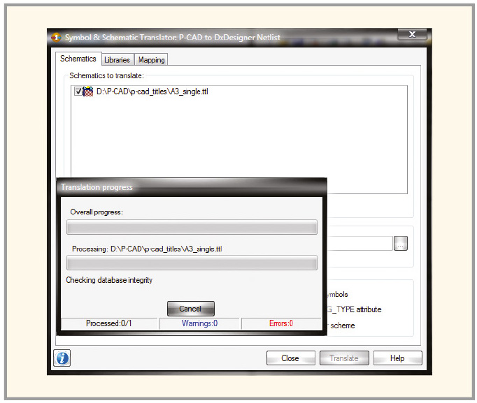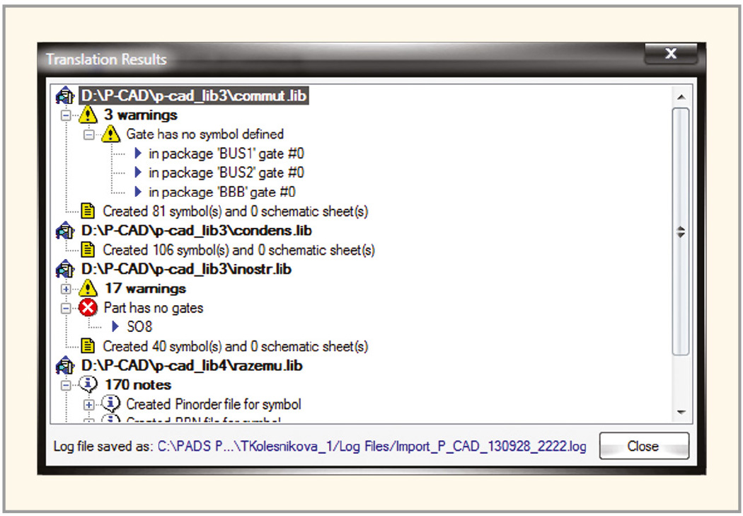 На рисунке 6 представлено окно Symbol & Schematic Translator в момент импорта файла штампа в проект Mentor Graphics. По окончании процесса импорта создаётся отчёт о наличии возможных ошибок, который автоматически сохраняется на диске компьютера с расширением *.log. После того как все шаблоны штампов добавлены в проект, закройте окно Symbol & Schematic Translator, нажав на кнопку Close в нижней части окна.