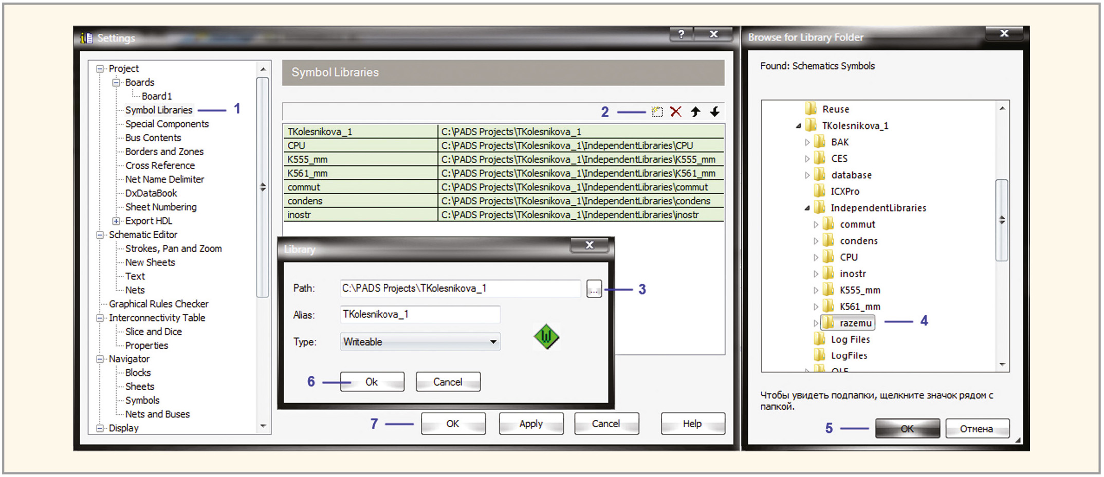 После того как все библиотеки добавлены, закройте окно Symbol & Schematic Translator, нажав на кнопку Close в нижней части окна. Для завершения процедуры импорта библиотеки в проект Mentor Graphics выберите в меню Setup редактора DxDesigner пункт Settings… и в левой панели открывшегося одноимённого окна в группе Project найдите пункт Symbol Libraries. Затем перейдите в правую панель и нажмите на значок (создать). Откроется окно Library, в котором в поле Path необходимо нажать на кнопку «…», после чего откроется окно Browse for Library Folder. В этом окне найдите на диске папку с проектом, выберите в ней папку Independent Libraries (Независимые библиотеки), затем – папку с файлами библиотеки, которую добавляете в проект (название папки будет совпадать с названием библиотеки). Теперь с помощью кнопки ОК закройте все открытые окна. Порядок выполнения описанных выше действий иллюстрирует рисунок 4.