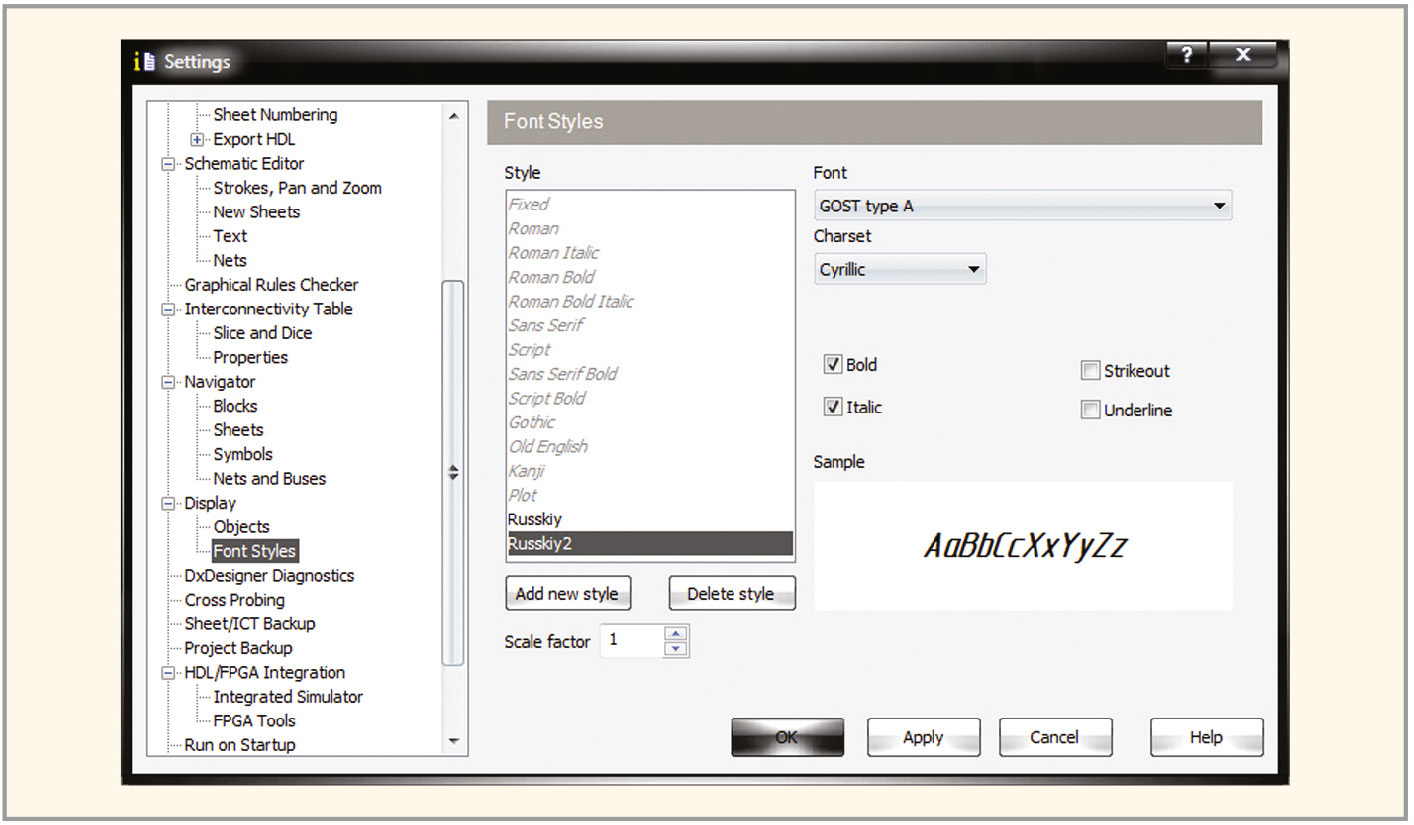 В редакторе DxDesigner в меню Setup выберите пункт Settings…, затем в левой панели отрывшегося окна Settings в группе Display – пункт Font Styles. В правой панели откроется окно Font Styles (см. рис. 7).