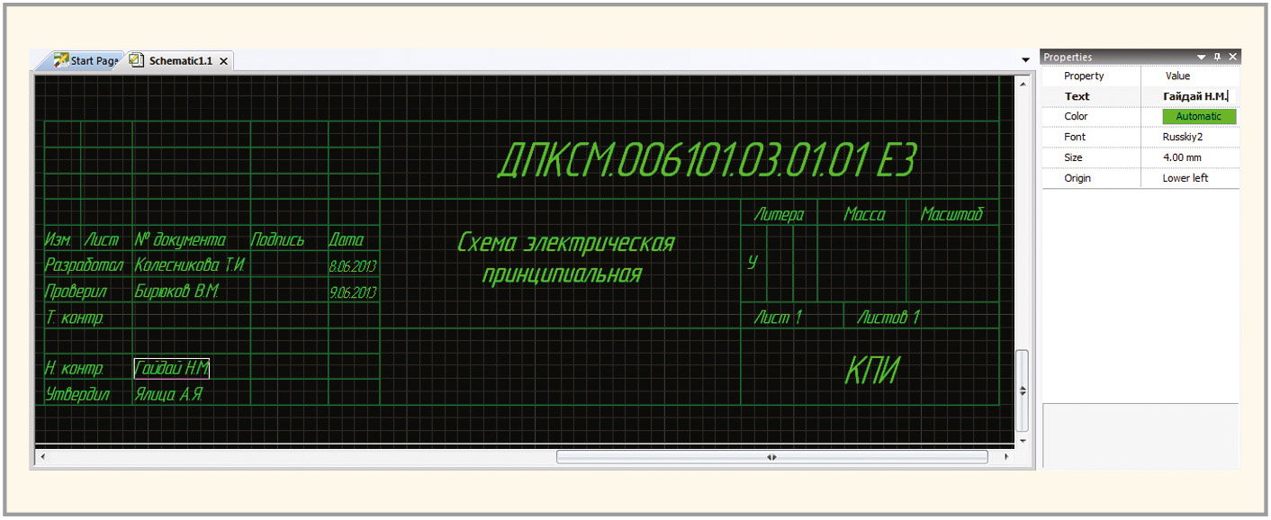 На рисунке 8 показан штамп чертежа, заполненный в редакторе DxDesigner русским чертёжным шрифтом GOST, а также панель Properties.