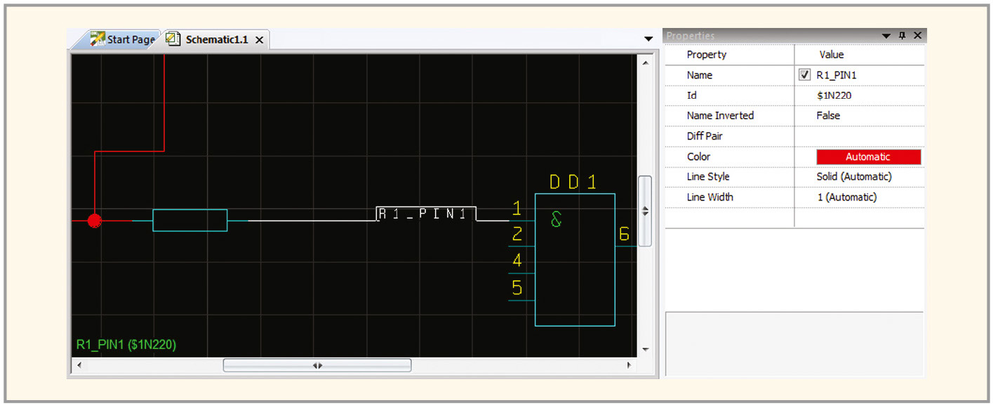 Каждой цепи в схеме можно присвоить имя. Для этого выберите в меню View/Other Windows пункт Selection Filter… и в открывшемся окне Select установите флажок в клетке Net and Bus. Все остальные флажки необходимо снять, затем окно Select можно закрыть. При помощи ЛКМ выберите цепь, которой присваивается имя, после чего в панели Properties отобразятся параметры этой цепи. Название цепи можно ввести в поле Name этой панели. Видимость названия цепи на схеме задаётся флажком в клетке той же строки. В окне Properties можно настраивать толщину (Line Width) и цвет (Color) выбранной на схеме цепи. Рисунок 10 демонстрирует цепь с присвоенным именем, которое отображается как на схеме, так и в панели Properties.