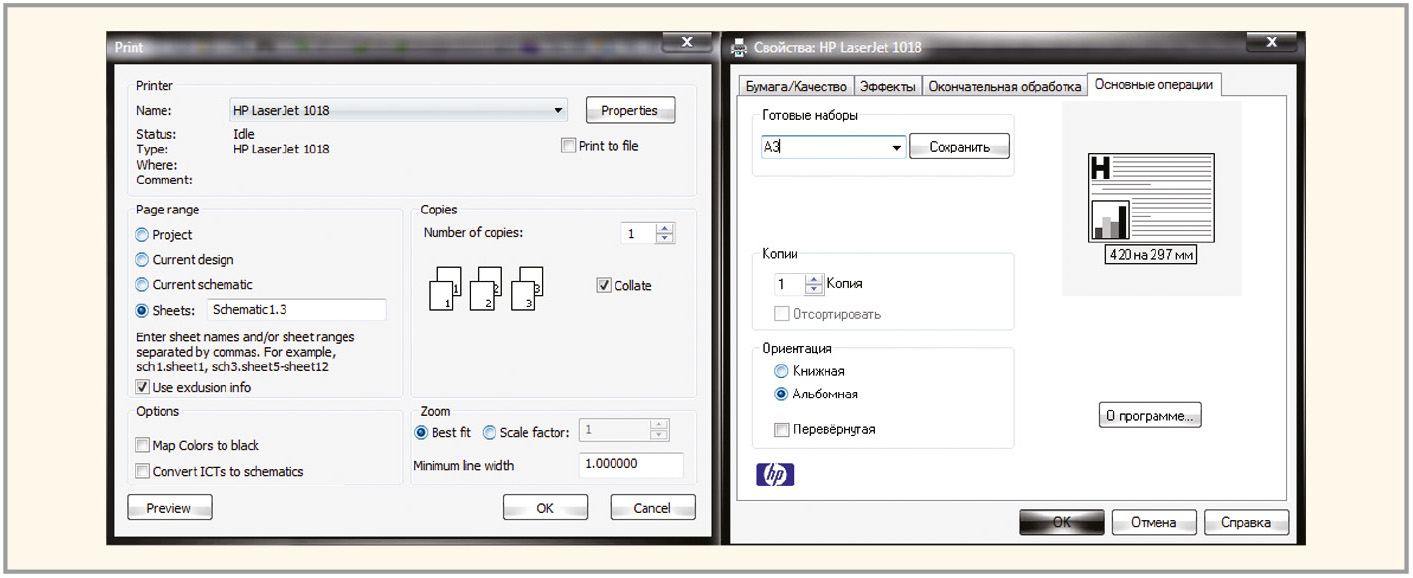 Печать можно производить на бумажные носители или в файл. Для вывода схемы на принтер (плоттер) необходимо в окне Print на панели Printer из выпадающего меню в поле Name выбрать устройство, на котором планируется распечатать схему, и нажать на кнопку Properties (свойства), чтобы настроить параметры печати. Рисунок 11 демонстрирует окно Print, параметры которого настроены для печати схемы на принтере, а также окно «Свойства: принтера», которое открылось после нажатия на кнопку Properties.