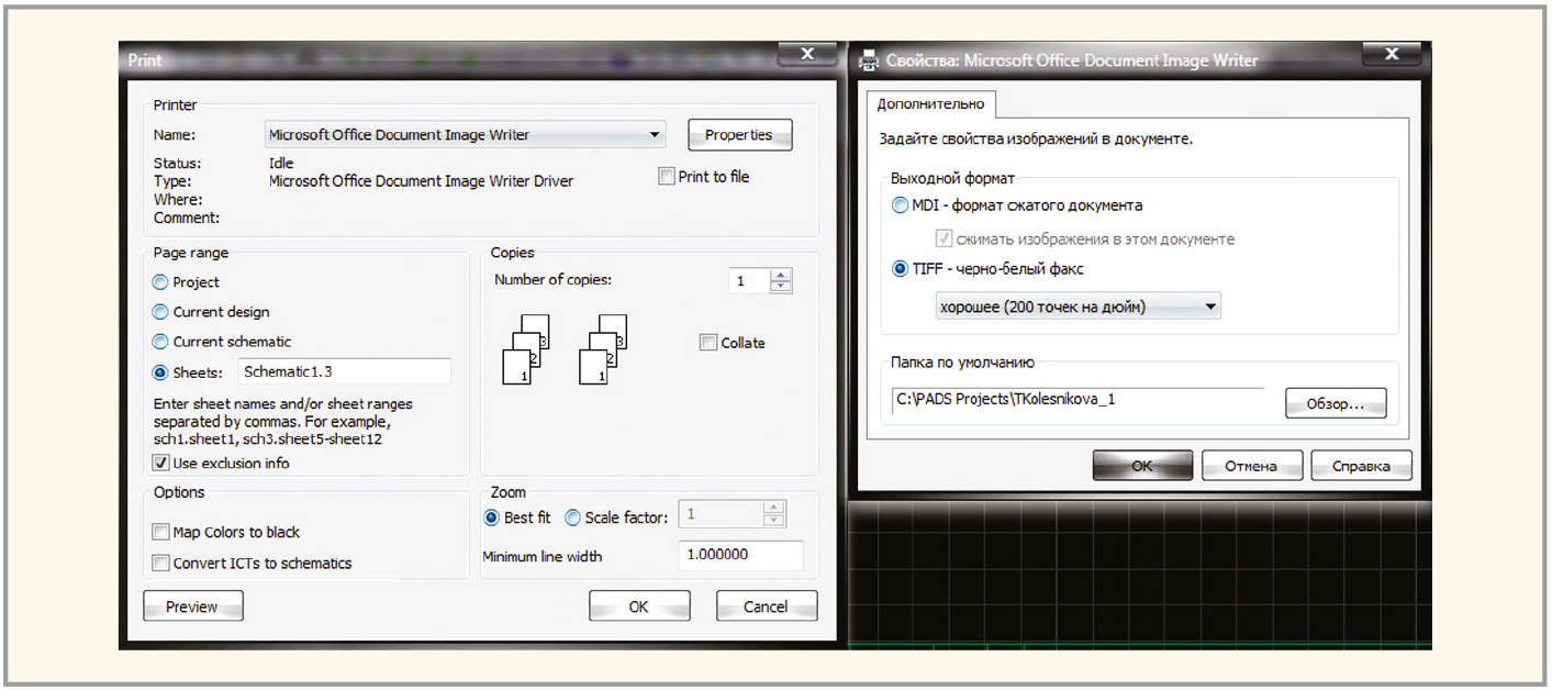 Рисунок 12 демонстрирует окно Print, параметры которого настроены для печати схемы в файл, а также окно «Свойства: Microsoft Office Document Image Writer». После того как параметры печати настроены, перейдите в окно предварительного просмотра (см. рис. 13).