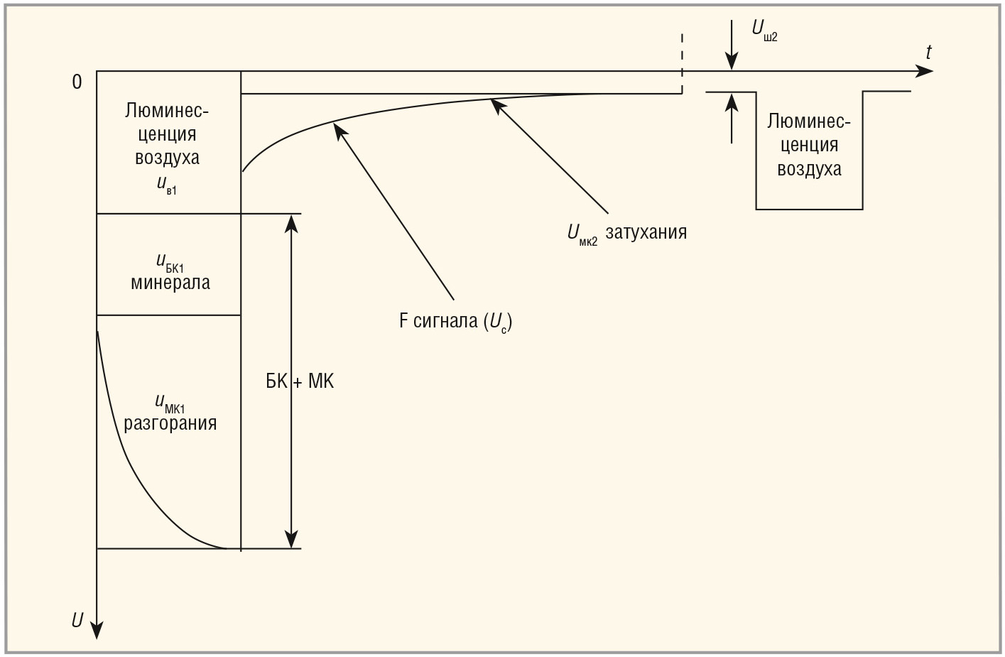 где uв1 – напряжение люминесценции воздуха в зоне возбуждения регистрации; uбк1 – напряжение быстрой компоненты (БК) люминесценции минерала; uмк1, uмк2 – напряжение медленной компоненты (МК), соответственно, разгорание и затухание, люминесценции минерала; uш1, uш2 – напряжение суммы электронных шумов и шумов ФЭУ.