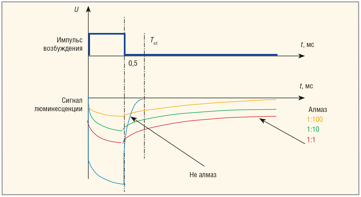 Выражение (9) органично дополняет признаки обнаружения (4), (8), описанные выше. Комплексное их использование обеспечивает надёжное выявление алмазов с типичной люминесценцией и одновременно позволяет выявлять алмазы второй группы, не имеющие медленной, но имеющие быструю компоненту люминесценции.