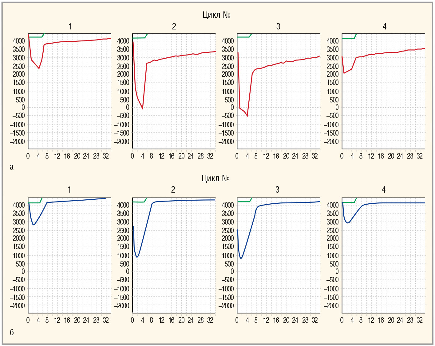 Рассмотрим динамическую погрешность. В реальном сепараторе не существует резко очерченной зоны возбуждения/регистрации, поэтому, приближаясь к этой зоне, часть наиболее сильно люминесцирующих минералов возбуждается и начинает испускать свет. Процесс по циклам иллюстрируется на рисунке 3а. Цикл 1 отражает возникновение «предвозбуждения». Без принятия специальных мер это приведёт к преждевременному обнаружению и потере алмаза, поскольку в результате такого «предвозбуждения» либо нарушаются соотношения между компонентами люминесценции, и возможно ложное обнаружение, либо сигнал люминесценции просто обнаруживается «досрочно». В результате этого акт отделения алмаза от потока материала также происходит преждевременно, и обнаруженный алмаз не попадает в сборник концентрата. Ложного обнаружения можно избежать [11], приняв во внимание характер изменения МК в последующих циклах 2 и 3, где МК растёт, и в цикле 4, где МК начинает падать. Этот цикл и учитывается как момент обнаружения.