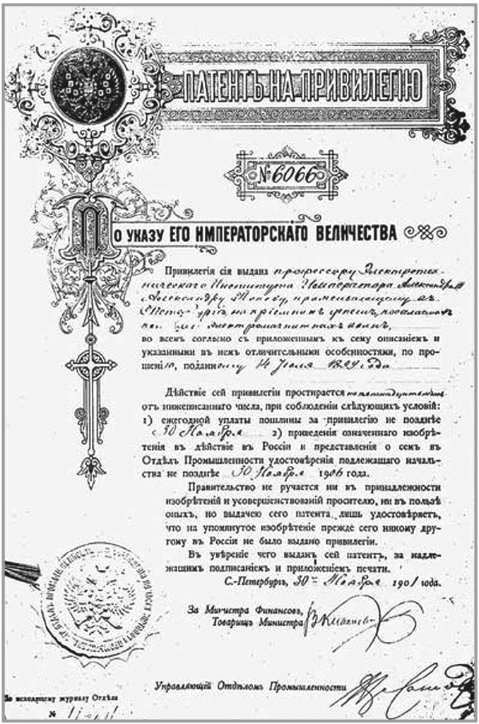 Хорошо известно, что 7 мая 1895 года Александр Степанович Попов продемонстрировал на заседании Русского физико-химического общества первый в мире действующий радиоприёмник [1]. И лишь летом 1897-го Гульельмо Маркони получил в Англии патент на аналогичное устройство. А.С. Попов первым продемонстрировал опыт радиотелеграфии, передав радиотелеграмму 24 марта 1896 года, что также произошло до патентной заявки Маркони. И наконец, радиостанции А.С. Попова применялись на морских судах ВМФ России.