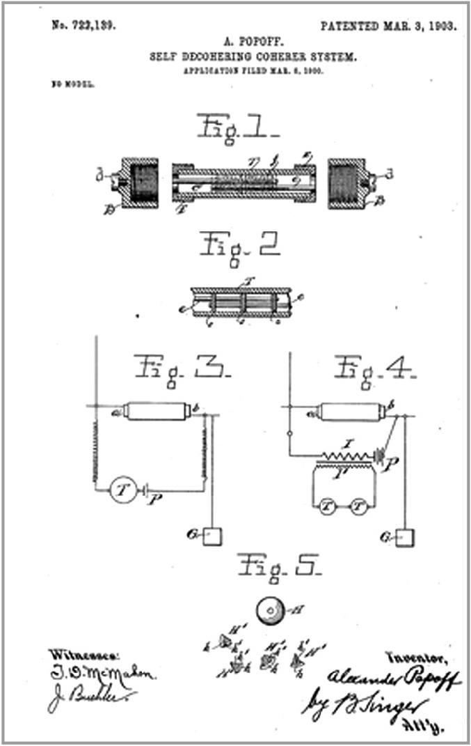 Особый интерес вызывает американский патент А.С. Попова, на который нигде и никогда не было ссылок. По номеру патента удалось отыскать его описание. Оригинальное название патента "SELF-DECOHERING COHERER SYSTEM". При этом декогерирующий прибор (в нашем понимании, детектирующий прибор), подробно описанный в патенте, назван А.С. Поповым радиокондуктором (radioconductor), как и в российском патенте.