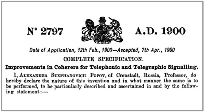 Первый детекторный радиоприёмник Попова, на который он получил патенты в России, Англии и Франции (см. рис. 1), был награждён золотой медалью на Всемирной выставке в Париже в 1900 году. У английского патента № 2797, выданного 25 февраля 1900 года, было уточняющее название: "Improvements in Coherers for Telephonic and Telegraphic Signalling". Русский патент (привилегия № 6066) имел более общее название: «Приёмник депеш, посылаемых с помощью электромагнитных волн» [3].