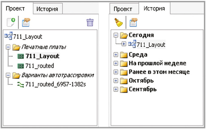 Панель проекта, ранее единая, разделена на две вкладки: Проект и История (см. рис. 1).