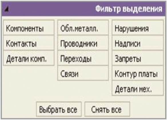 При этом теперь можно выбирать по отдельности те объекты, которые раньше были объединены: связи, контур платы, детали компонентов, области металлизации.