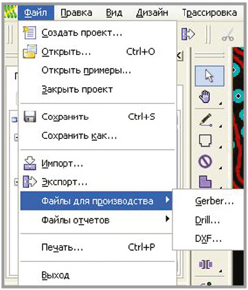 Создание файлов для шаблонов или документации перемещено в меню «Файл». Пункт «Файлы для производства» (см. рис. 4) содержит Gerber, Drill и DXF файлы, а «Файлы отчётов» – BOM и ECO.