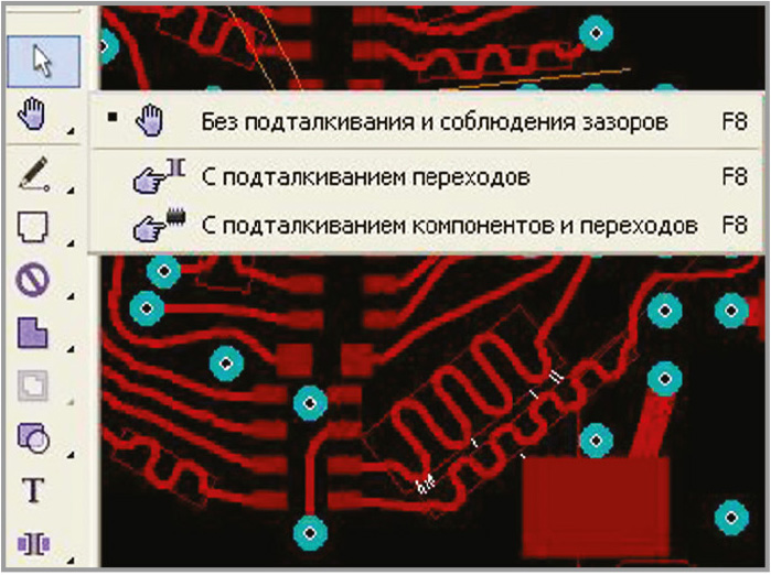 , задающей режим перемещения объектов, аналогичный режиму Freestyle. Если щёлкнуть по этой кнопке правой клавишей мыши, то появляется контекстное меню, в котором можно выбрать один из трёх вариантов перемещения объектов – «Без подталкивания и соблюдения зазоров» (см. рис. 7), «C подталкиванием переходов», «C подталкиванием компонентов и переходов».