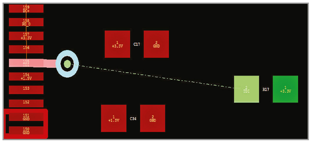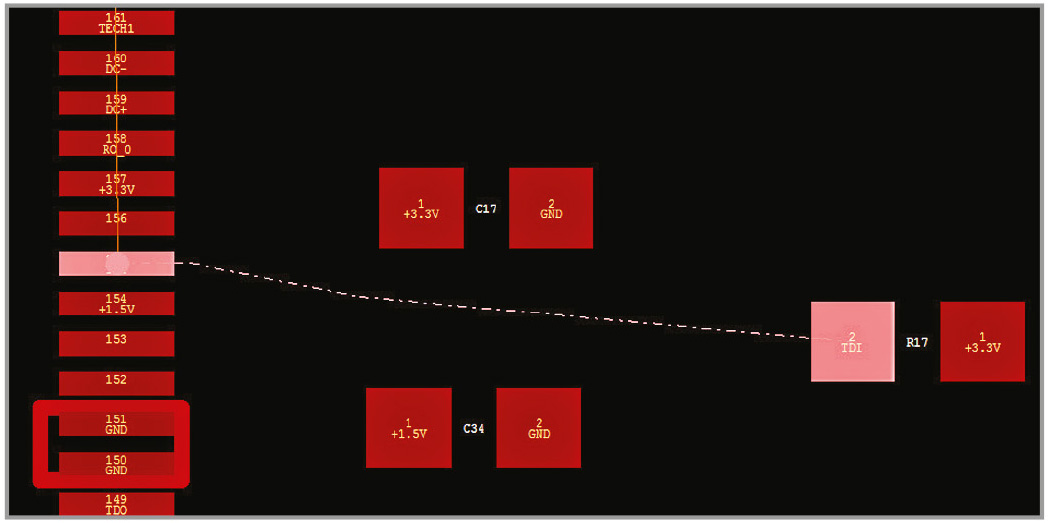 Кроме того, для трассировки BGA реализовано подключение нескольких контактов одной цепи к одному переходу в том случае, если не хватает свободных ячеек, а также размещение перехода ближе к «своему» контакту, если по центру переход не помещается.
