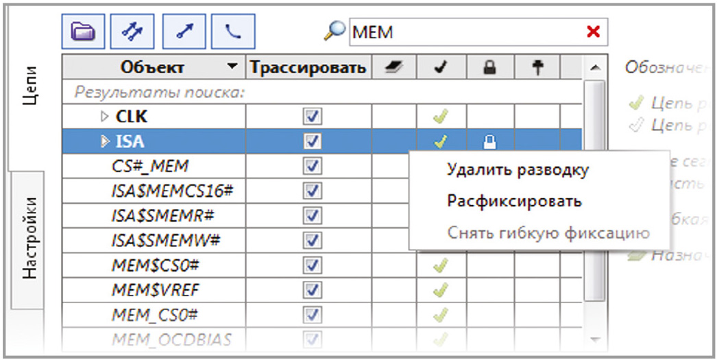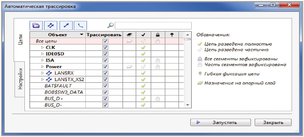Используя «галочку», можно отметить в таблице трассируемые и не трассируемые цепи. Используя правую клавишу мыши, можно удалить разводку отдельной цепи, группы цепей или всей платы. Остальные колонки таблицы вспомогательные – подсказывают дополнительную информацию о цепях: назначение на опорный слой, уже осуществлённая полная или частичная разводка, фиксация всей или части цепи, гибкая фиксация цепи.