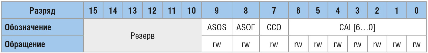 Разряд CCO подключает сигнал калибровки к многоцелевому выводу PC13-TAMPER-RTC. Если этот разряд имеет состояние «0» – сигнал отключён, а если «1» – подключён сигнал калибровки, представляющий собой импульсы тактовой частоты генератора RTC, поделённые на 64. Этот разряд сбрасывается при отключении питания микроконтроллера.