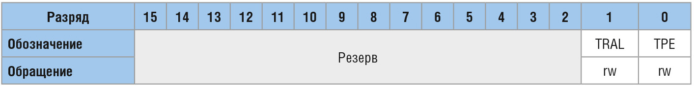 Разряд TRAL определяет альтернативное назначение многоцелевого вывода PC13-TAMPER-RTC. Если этот разряд имеет состояние «0», то все информационные регистры BKP сбрасываются от высокого уровня сигнала на выводе PC13-TAMPER-RTC, а если состояние «1» – от низкого уровня сигнала на том же выводе. При этом должен быть предварительно установлен в единичное состояние разряд TPE.