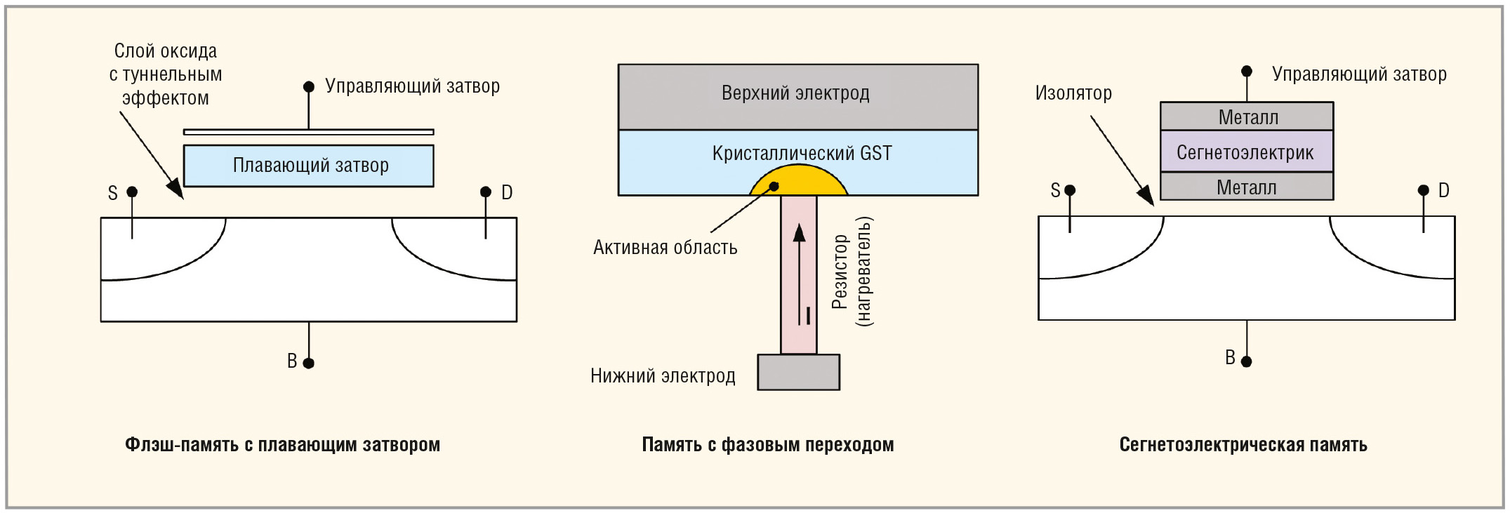 Флэш-память на транзисторах с плавающим затвором впервые получила широкое распространение в 1990-х гг. и до недавнего времени вполне отвечала требованиям, предъявляемым к энергонезависимой памяти в таких устройствах, как цифровые камеры, MP3-плееры и смартфоны. Тем не менее, определённые ограничения, связанные с её скоростью, износом, потребляемой мощностью и объёмом, заставляли исследователей обращаться к новым технологиям энергонезависимой памяти, таким как: память с фазовым переходом (PCM/PRAM); флэш-память с ловушками заряда (CTF/SONOS); резистивная память (ReRAM); сегнетоэлектрическая память (FeRAM); магниторезистивная память (MRAM) и т.д. (см. рис. 1).