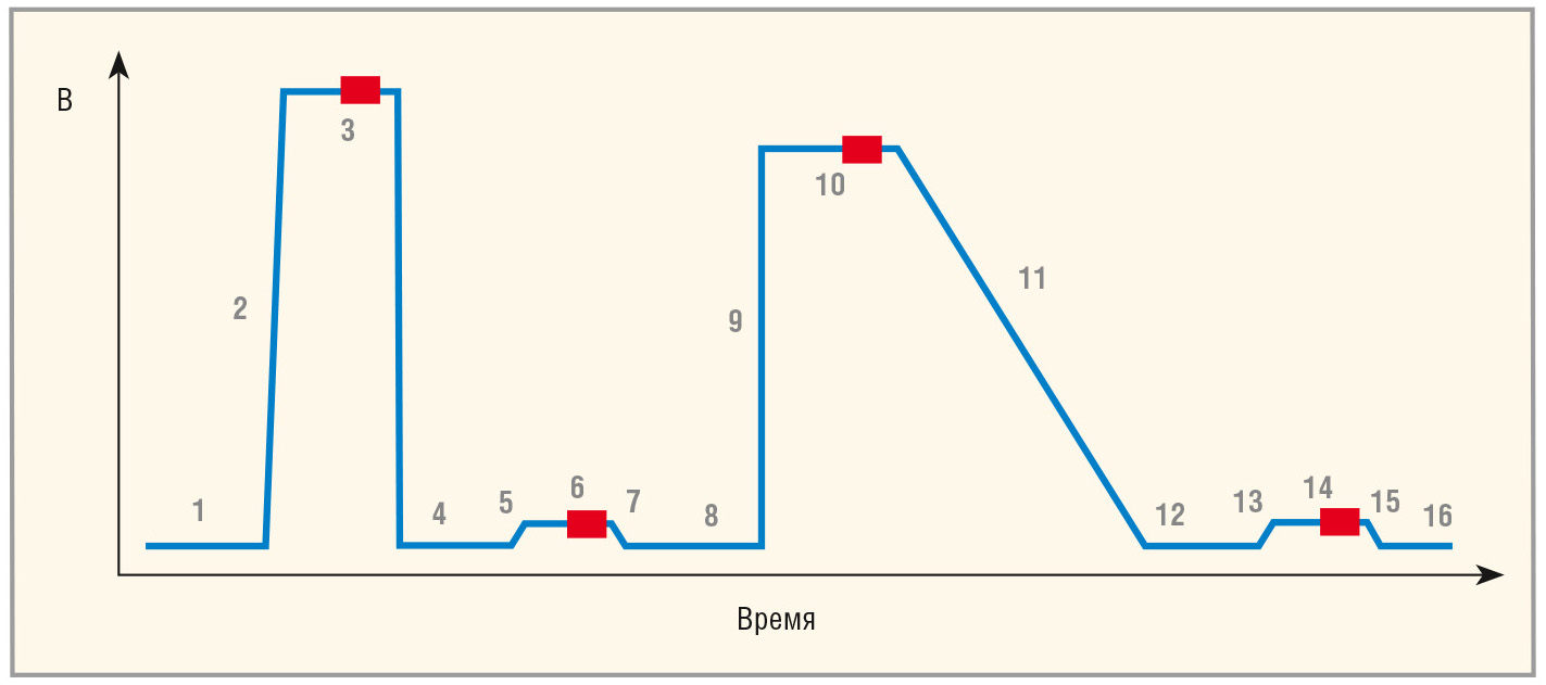 3. Очень важно обеспечение точности поддержания заданной формы импульсов, поскольку поведение памяти при изменении состояния носит нелинейный характер. Устройства памяти очень чувствительны к амплитуде импульса напряжения. На форму импульса влияют погрешности задания амплитуды и наличие звона, выбросов и провалов, минимизация которых очень важна. Современные приборы для измерения импульсных ВАХ гарантируют уровень выбросов и звона не более 3% от амплитуды импульса. Помимо формирования прямоугольных импульсов с точно заданной амплитудой для тестирования новых видов энергонезависимой памяти зачастую требуются сигналы сложной формы, задаваемой исследователем. Например, для тестирования ReRAM часто требуется подача импульсов с плавно изменяющимся уровнем при одновременном измерении тока. Для тестирования FeRAM необходима последовательность из четырёх импульсов PUND (положительный, вверх, отрицательный, вниз). Для тестирования новых типов энергонезависимой памяти может потребоваться подача сложных импульсных сигналов, состоящих из сегментов произвольной формы, с необходимостью выполнения нескольких измерений в пределах каждого сегмента. На рисунке 3 показан сложный импульсный сигнал, состоящий из 16 сегментов линейно меняющегося напряжения (серые цифры).