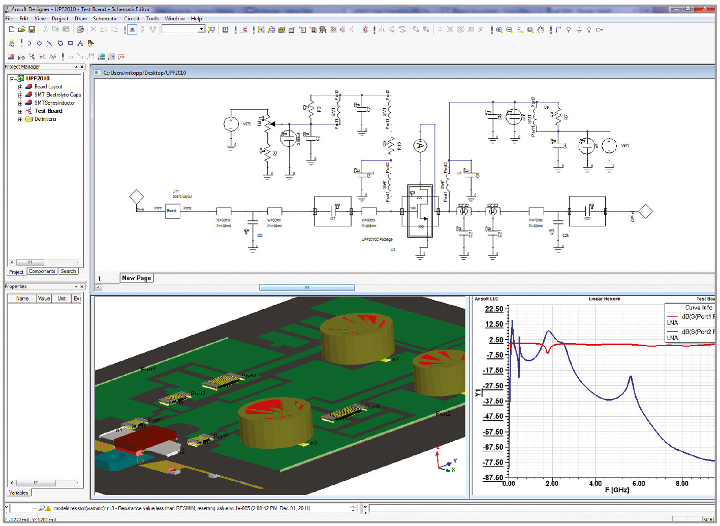 - ANSYS Designer RF – самая полная конфигурация объединяет функциональные возможности ANSYS Designer RF Circuit и ANSYS Designer RF Plannar EM. На рисунке 2 в качестве примера представлена принципиальная схема усилителя, разработанного в ANSYS Designer RF, его топология и результаты моделирования S-параметров.
