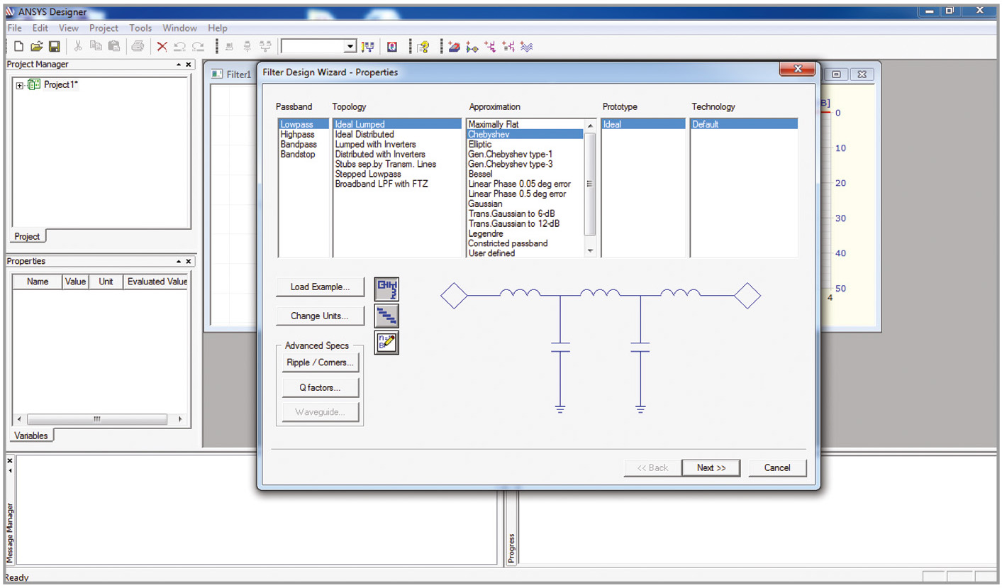 Интерактивная среда проектирования Filter Design Tool (см. рис. 3) позволяет разрабатывать различные ВЧ- и СВЧ-фильтры: Бесселя, Гаусса, Чебышева; полосковые и микрополосковые, верхних и нижних частот, сосредоточенные и распределённые, на связанных линиях передач и др. Созданные фильтры могут быть дополнительно оптимизированы или сразу подключены к проекту.
