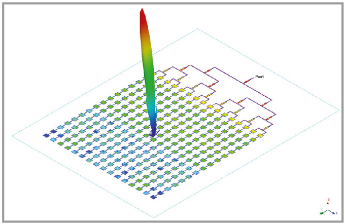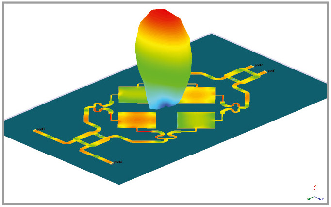 На рисунке 4 представлено распределение тока в дальней зоне усиления антенной решётки размером 4 × 4. Топология разработана в редакторе ANSYS Designer RF. Моделирование проведено в ANSYS HFSS при подключении технологии Solver on Demand, которая обеспечивает наилучшую на сегодняшний день точность и возможность автоматизации процесса проектирования, необходимые для сокращения длительности цикла разработки устройств и выпуска готовых изделий на рынок.