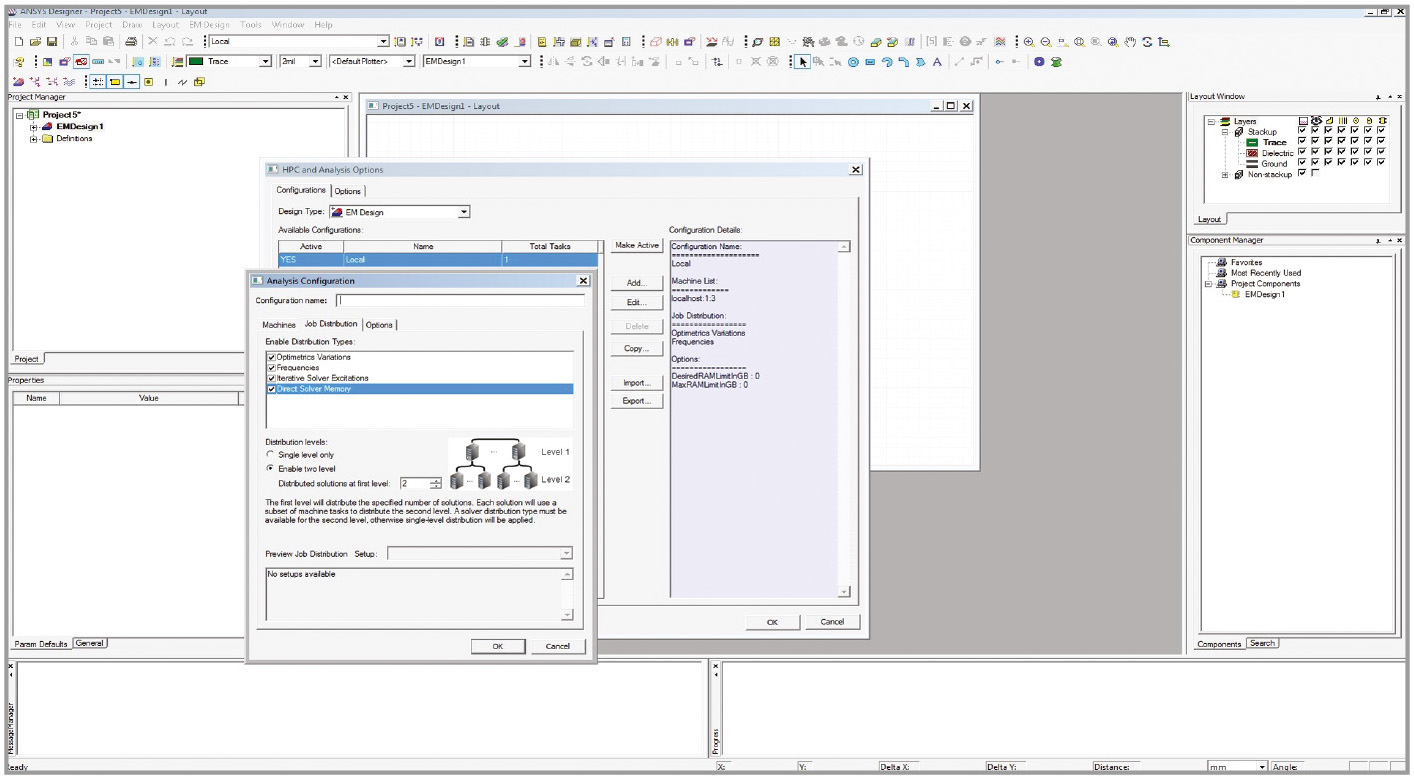 Пакет программ ANSYS Designer предоставляет возможность расчёта проектируемого устройства на более мощном удалённом компьютере или вычислительном кластере. Дополнительная опция AnsoftLinks ECAD позволяет импортировать топологии печатных плат из САПР Cadence, Mentor Graphics, Altium и Zuken.
