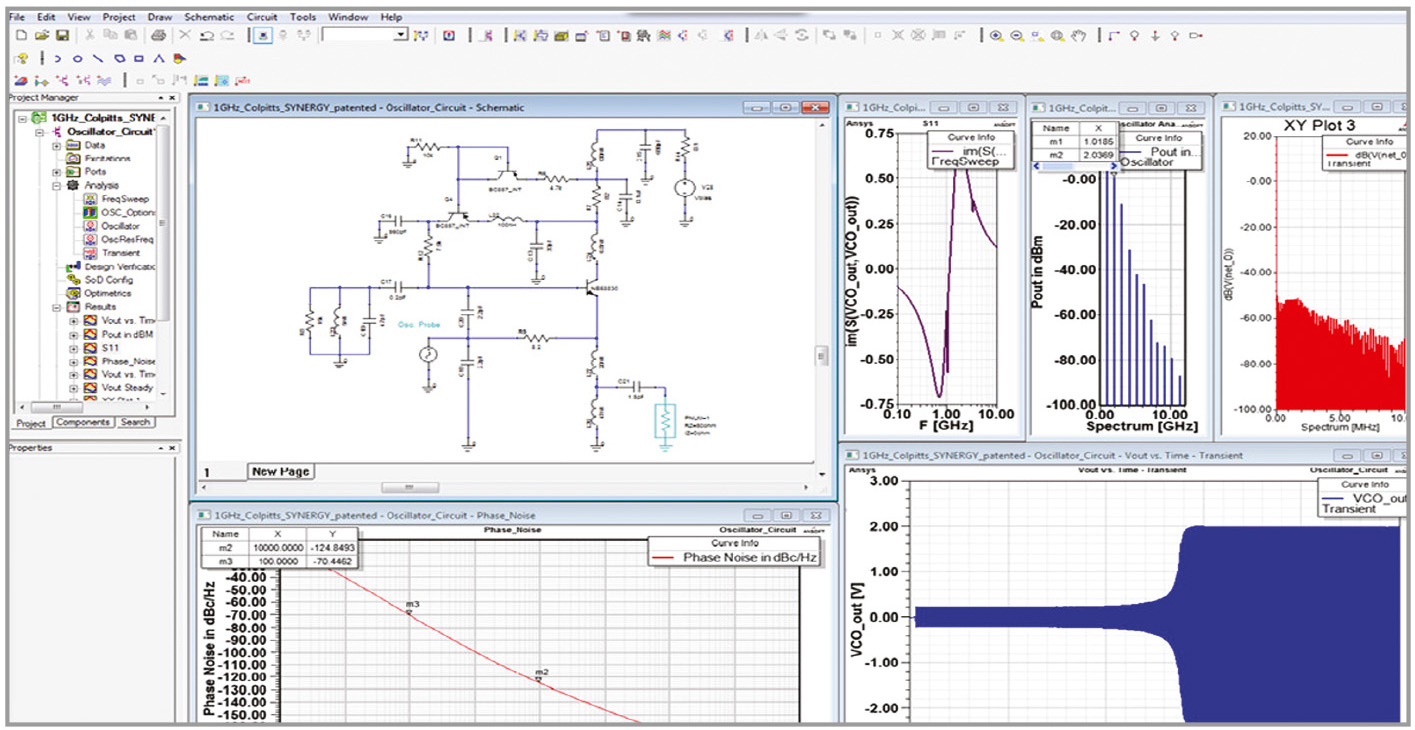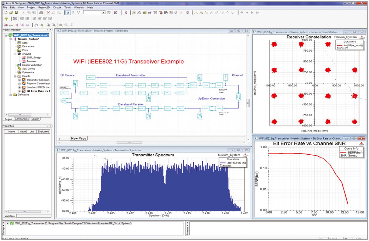 Моделирование системы запускается непосредственно из пользовательского интерфейса ANSYS Designer Desktop, который содержит интуитивно понятный редактор принципиальных схем. На рисунке 8 представлен системный редактор и результаты моделирования приёмопередатчика стандарта 802.11g. В редакторе принципиальных схем пользователи могут получить более высокую детализацию при совместном использовании численного и электромагнитного анализа.